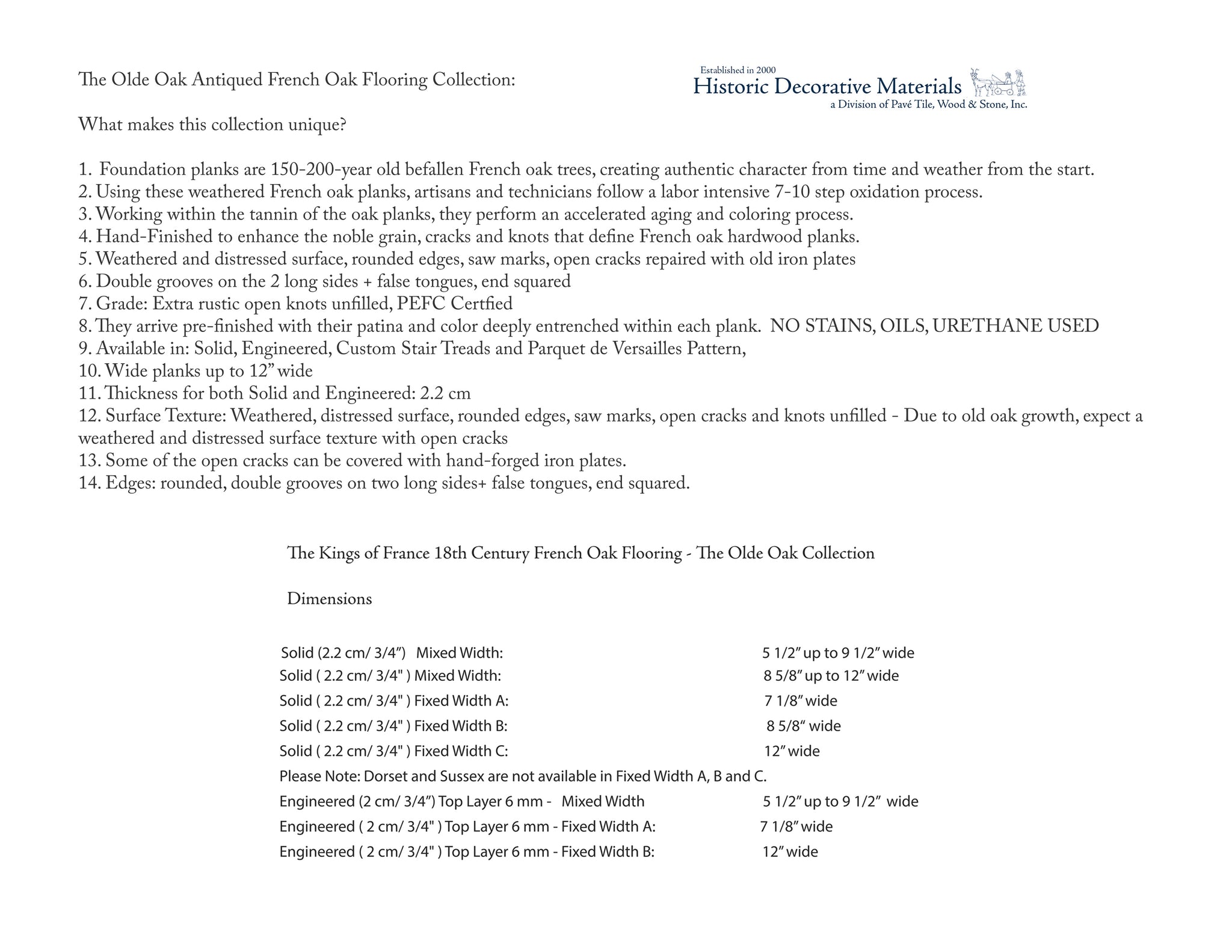 The Olde Oak Collection Antiqued French Oak Flooring is not a new oak floor aged to appear like an 18th century wood floor and it's not a salvaged reclaimed French oak floor pulled from noble homes and farmhouses across France. This noble French oak floor is a combination of found, within certified managed forests, 100-year old fallen oak trees as the foundation planks. This old oak growth, aged with character, knots and grain from living a century or more, and then being naturally weathered along the forest floor, becomes a reclaimed-like canvas upon which woodworkers and technicians begin the 7-10 step oxidation method, with drying time in-between, to continue to age the oak from the inside out. The oxidation method works within the tannin of the oak planks that change the composition of the wood, providing a matte patina and colors that are intermingled within the patterns and grain of the oak floor. There are no reactive stains or colored oils used in this process that can make wood floors appear false and inauthentic. What remains are incredibly beautiful and authentic wood floors that exude historic accuracy for aesthetics like Shaker and Classic English interiors to Belgian Farmhouse, Mid-Century Modern and Minimalist decors.