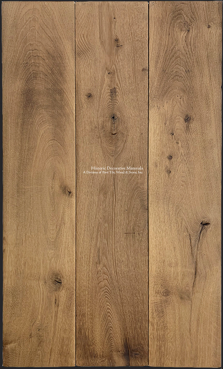 The Olde Oak Collection is not a new oak floor aged to appear like an 18th century wood floor and it's not a salvaged reclaimed French oak floor pulled from noble homes and farmhouses across France. This noble French oak floor is a combination of found, within certified managed forests, 100-year old fallen oak trees as the foundation planks. This old oak growth, aged with character, knots and grain from living a century or more, and then being naturally weathered along the forest floor, becomes a reclaimed-like canvas upon which woodworkers and technicians begin the 7-10 step oxidation method, with drying time in-between, to continue to age the oak from the inside out. The oxidation method works within the tannin of the oak planks that change the composition of the wood, providing a matte patina and colors that are intermingled within the patterns and grain of the oak floor. There are no reactive stains or colored oils used in this process that can make wood floors appear false and inauthentic. What remains are incredibly beautiful and authentic wood floors that exude historic accuracy for aesthetics like Shaker and Classic English interiors to Belgian Farmhouse, Mid-Century Modern and Minimalist decors.