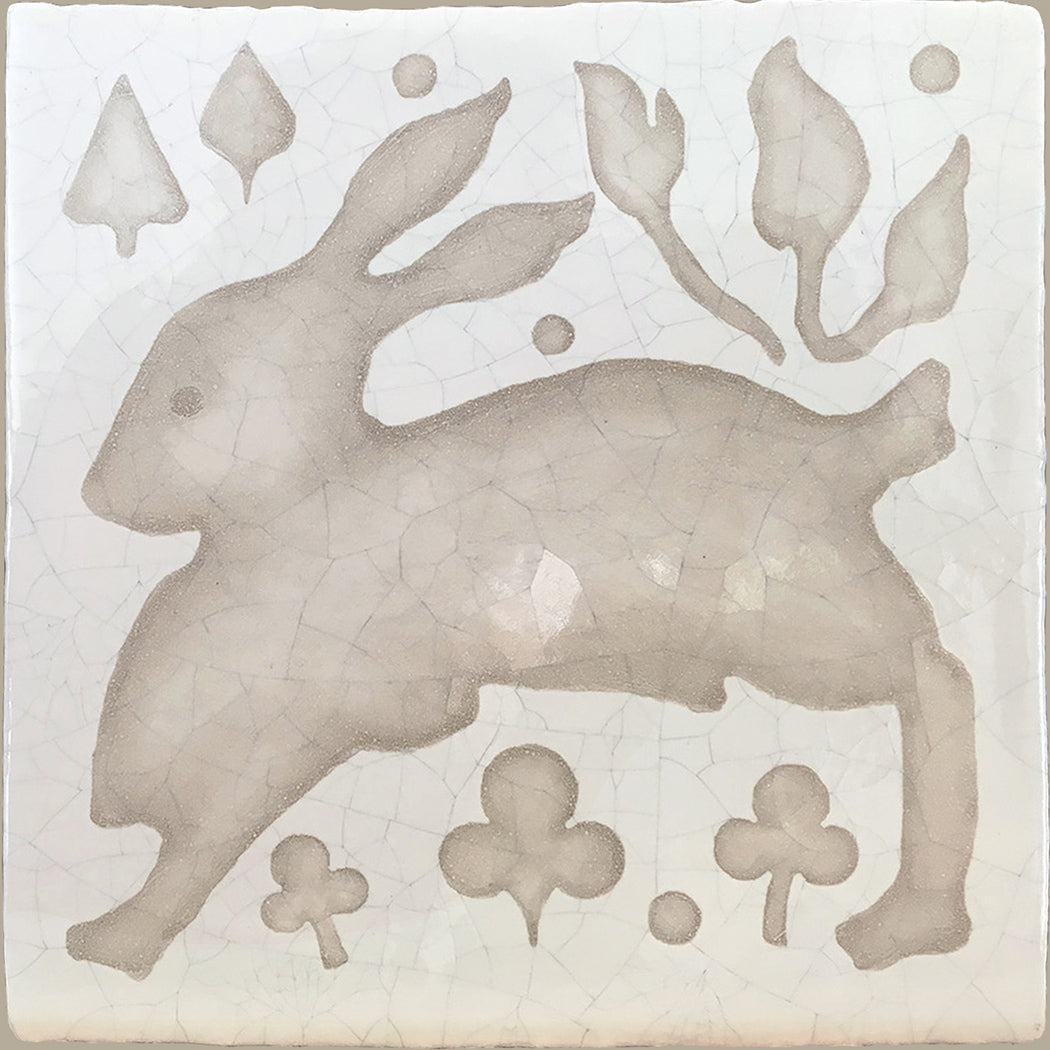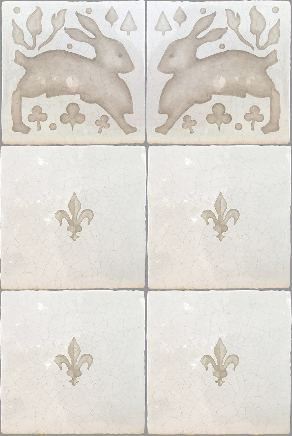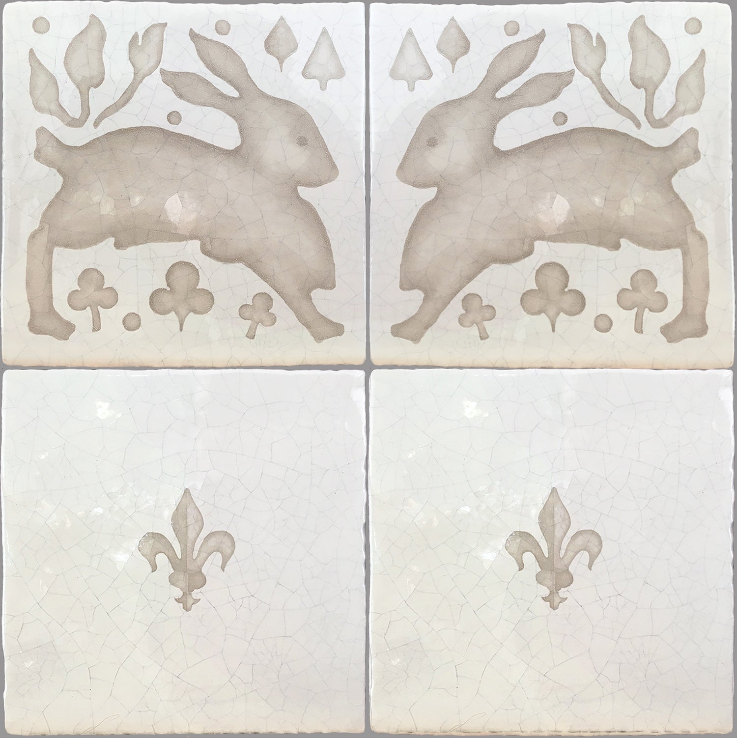 Hand-painted French encaustic decorative glazed ceramic wall tiles with a distinctive hand-crackled finish, inspired by 14th-century French motifs. Drawn from historic encaustic patterns—including the fleur-de-lys and the natural world—each tile is developed from carefully studied sources and translated through the artist’s hand. Kiln-fired and delicately etched, the surface reveals a soft, crackled patina reminiscent of antique ceramic, with subtle irregularities that preserve the depth and authenticity of early European craftsmanship.