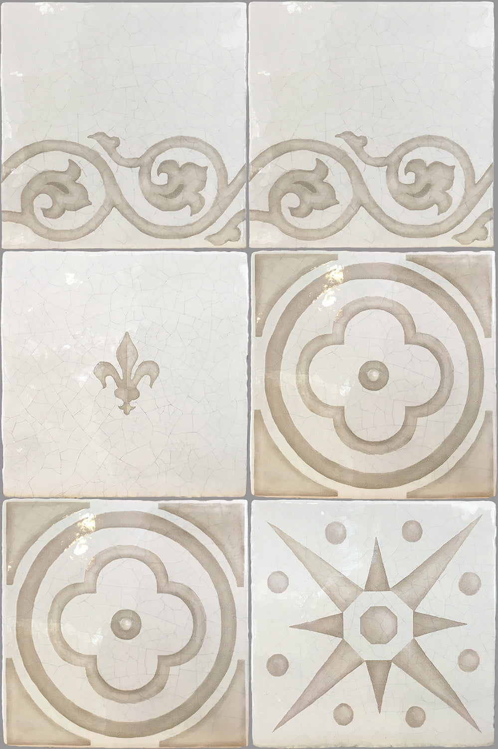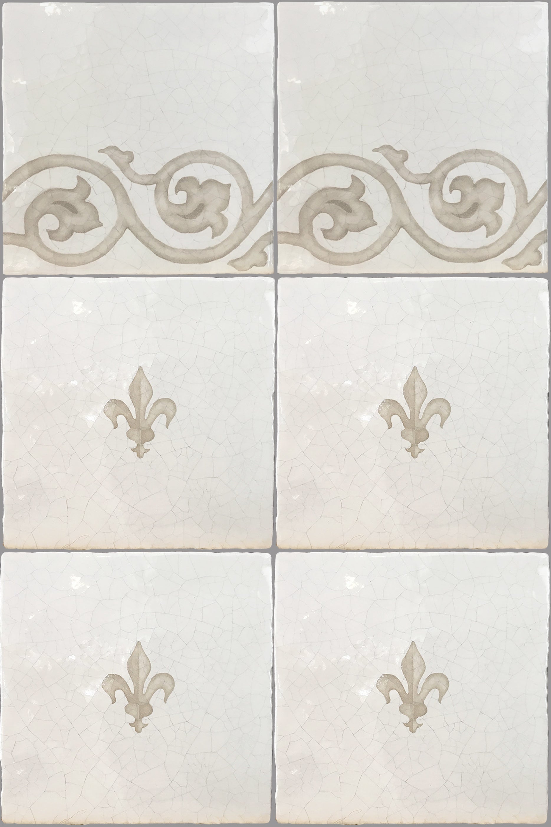 Hand-painted French encaustic decorative glazed ceramic wall tiles with a distinctive hand-crackled finish, inspired by 14th-century French motifs. Drawn from historic encaustic patterns—including the fleur-de-lys and the natural world—each tile is developed from carefully studied sources and translated through the artist’s hand. Kiln-fired and delicately etched, the surface reveals a soft, crackled patina reminiscent of antique ceramic, with subtle irregularities that preserve the depth and authenticity of early European craftsmanship.